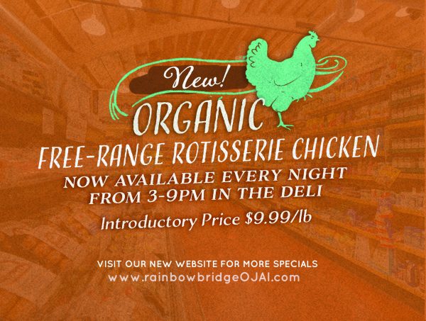 Rainbow Deli is now offering rotisserie chicken, available daily, from 3 to 9 p.m. Using free-range Smart Chicken, introductory, prices are $9.99 per pound or $26 for an entire chicken.